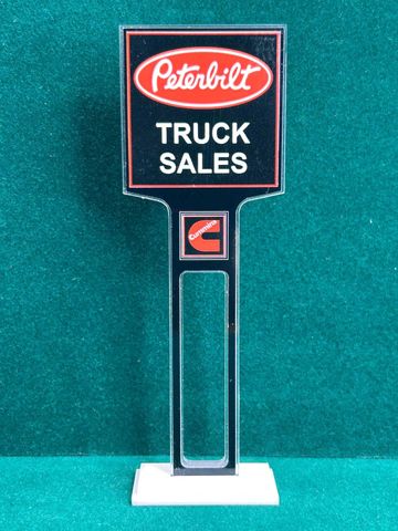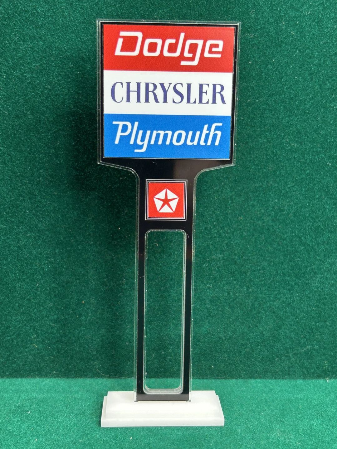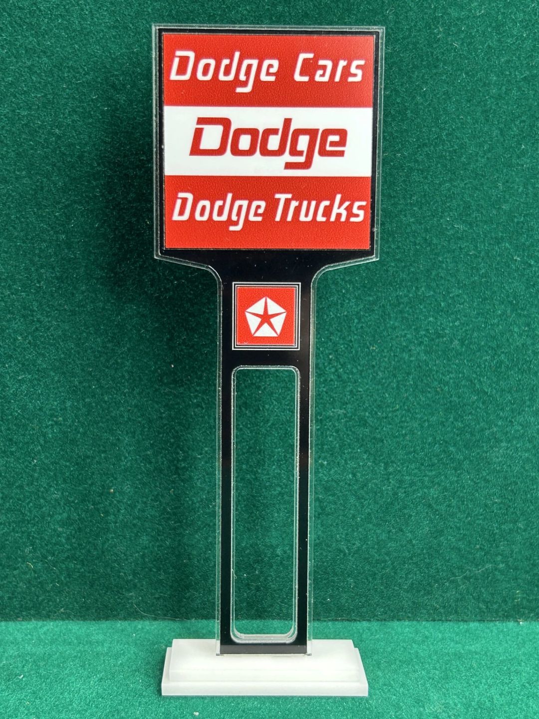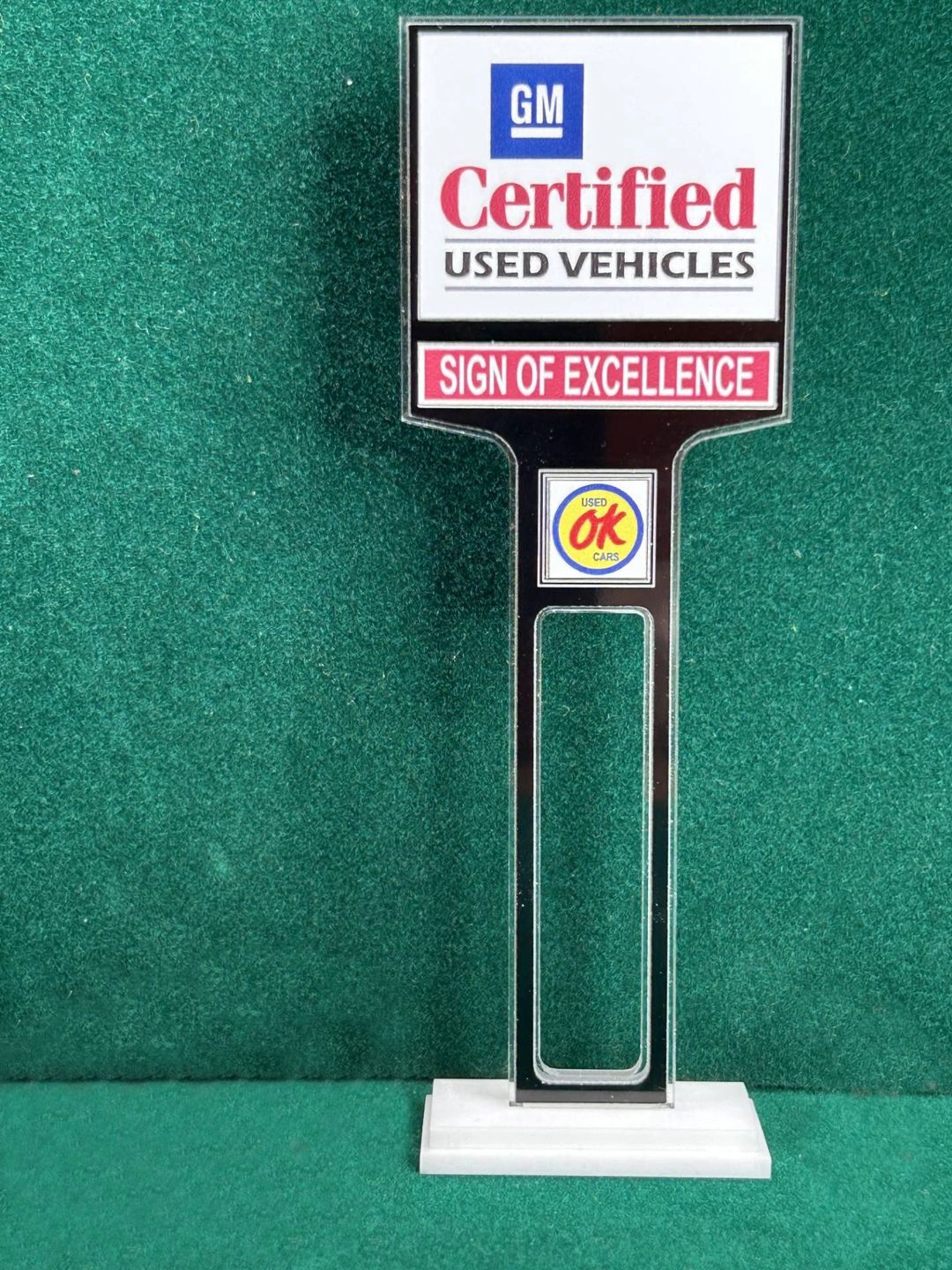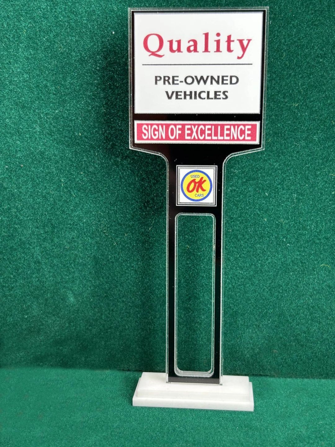 1/4” thick, white acrylic upright with a white acrylic overlay for the graphics. The base is 1/4” white acrylic. Approximate Size of the Dealership Lot Sign is 5.28” tall and 2.66” wide. Approximate Size of the Base is 2.66” x 1.00”