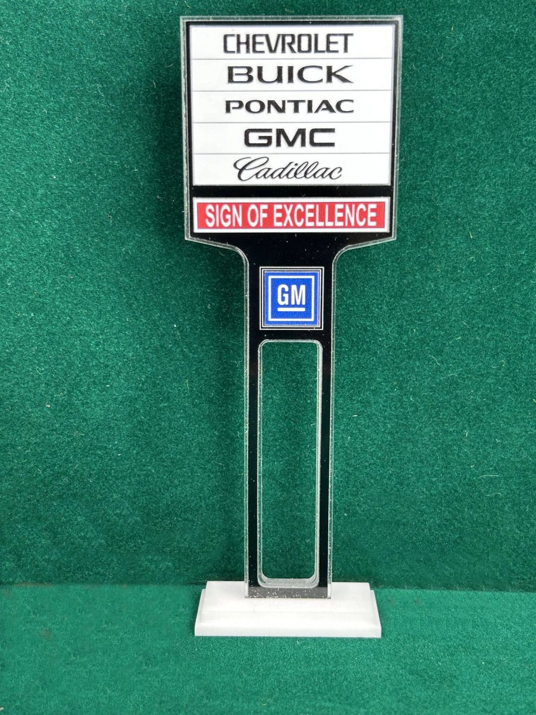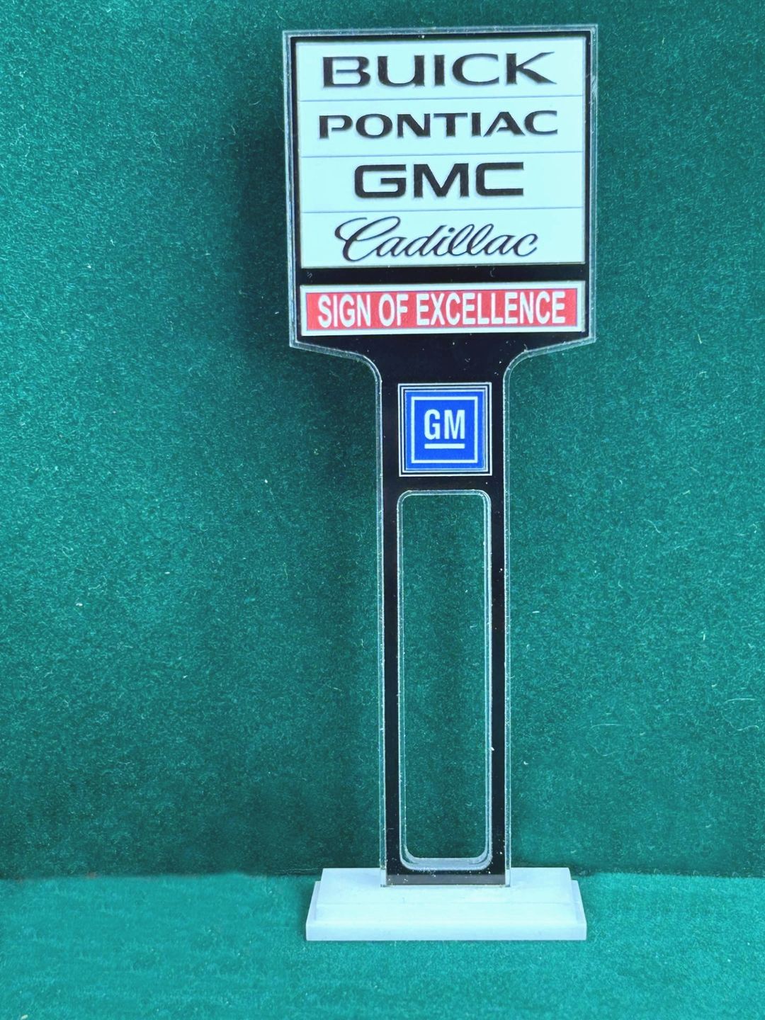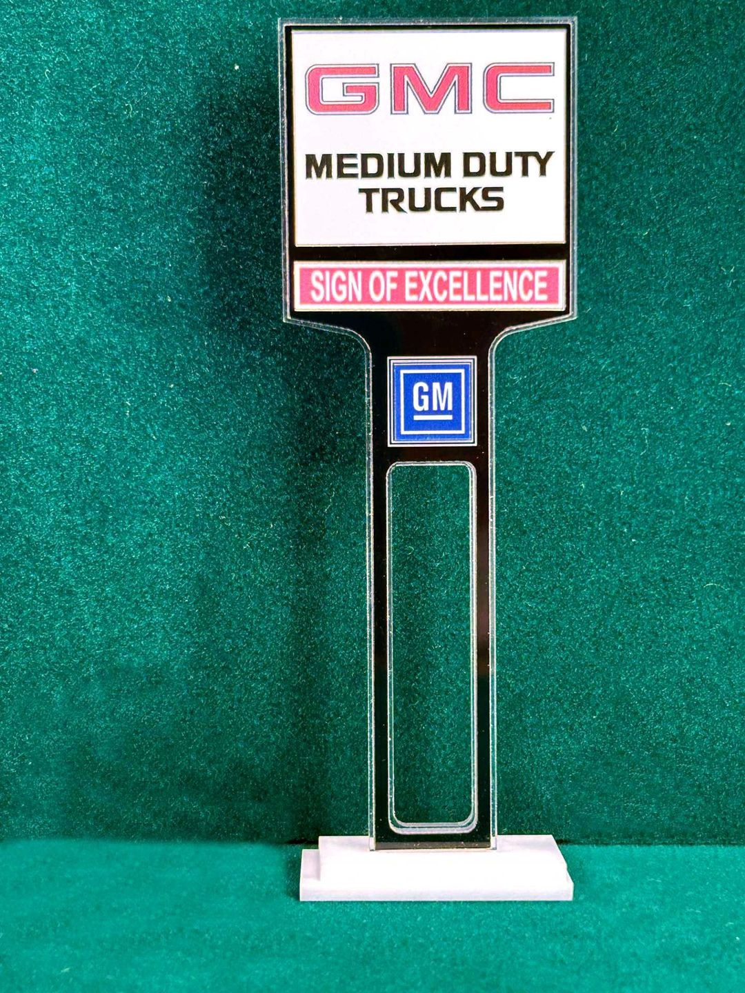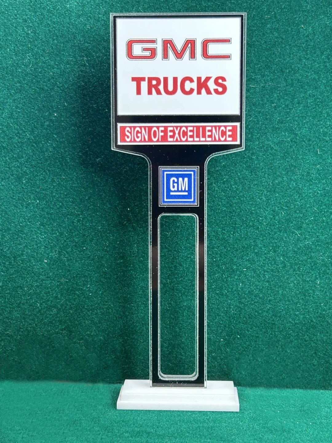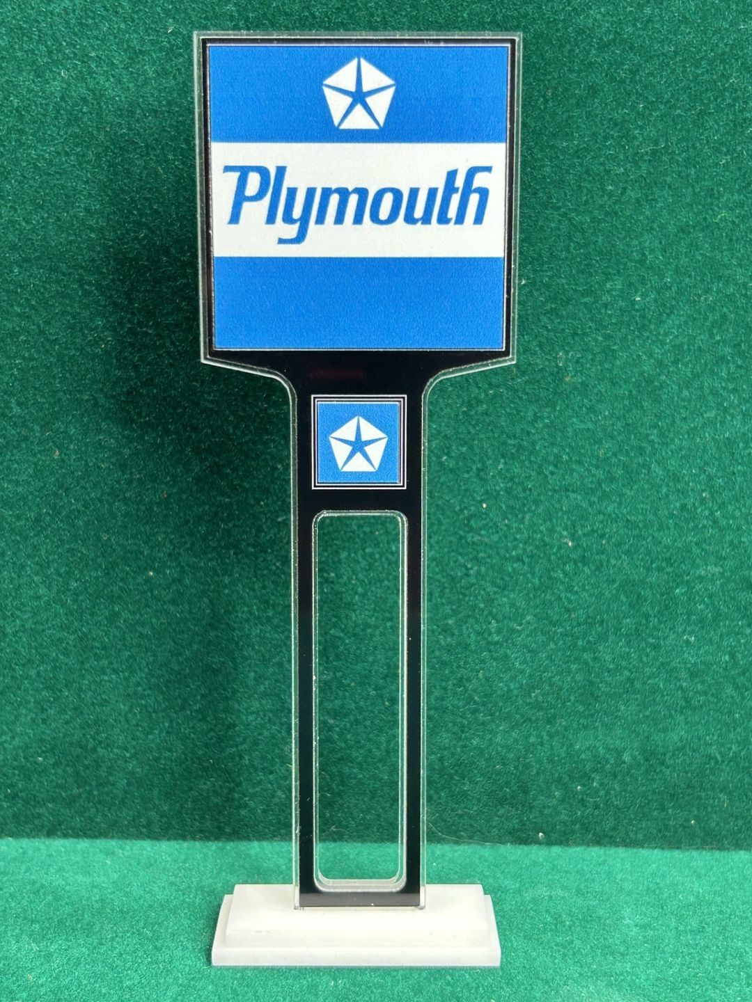 1/4” thick, white acrylic upright with a white acrylic overlay for the graphics. The base is 1/4” white acrylic. Approximate Size of the Dealership Lot Sign is 5.28” tall and 2.66” wide. Approximate Size of the Base is 2.66” x 1.00”