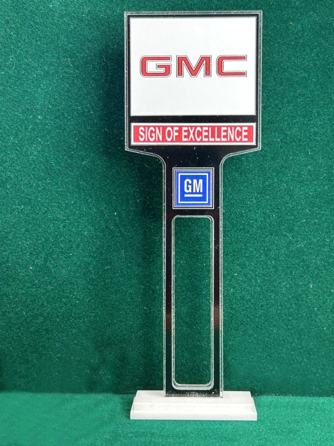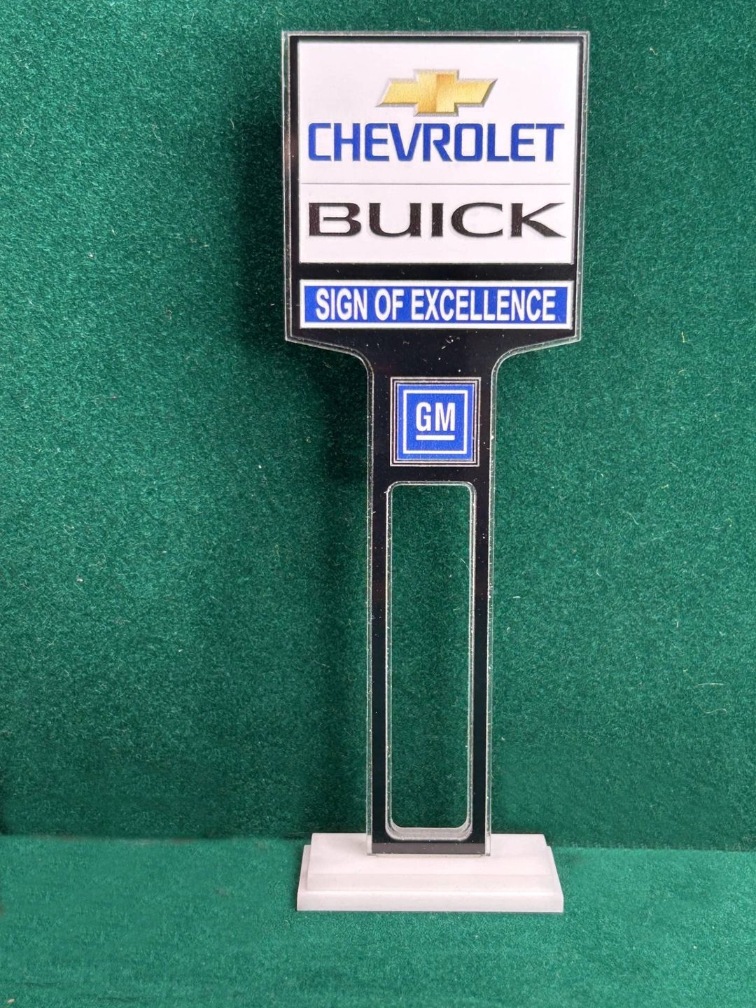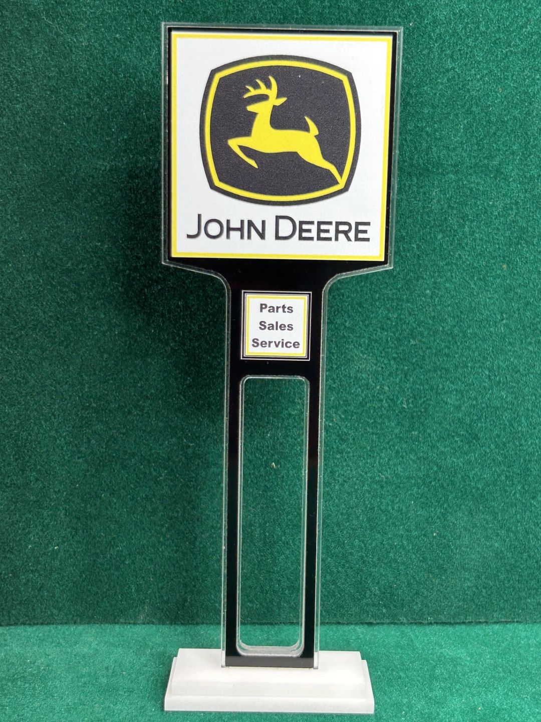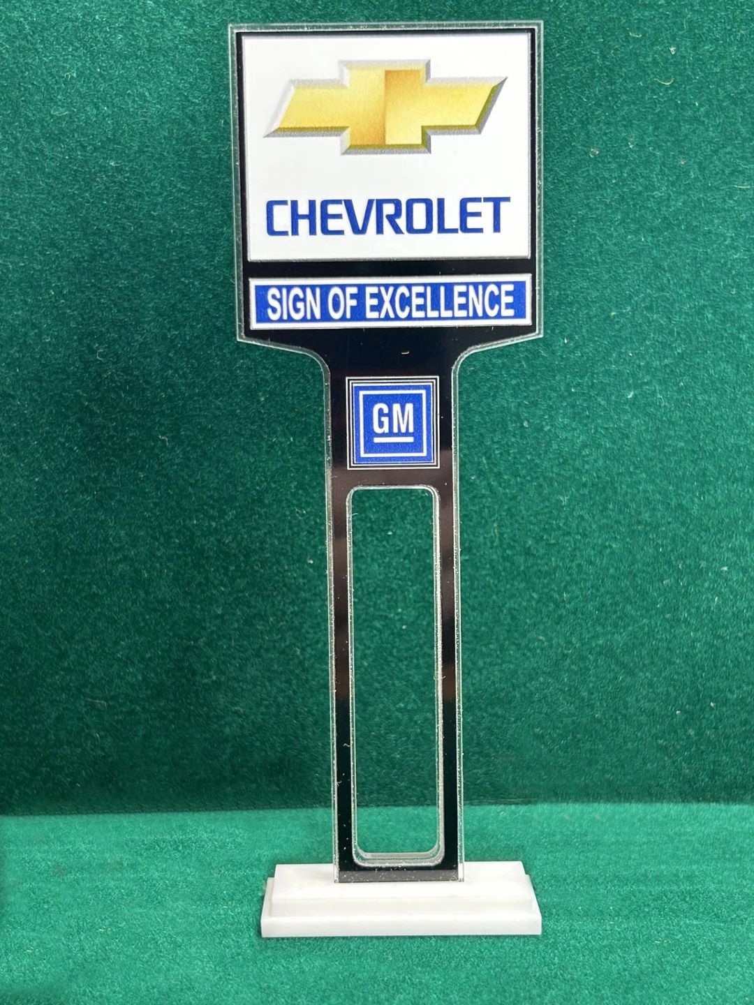1/4” thick, white acrylic upright with a white acrylic overlay for the graphics. The base is 1/4” white acrylic. Approximate Size of the Dealership Lot Sign is 5.28” tall and 2.66” wide. Approximate Size of the Base is 2.66” x 1.00”