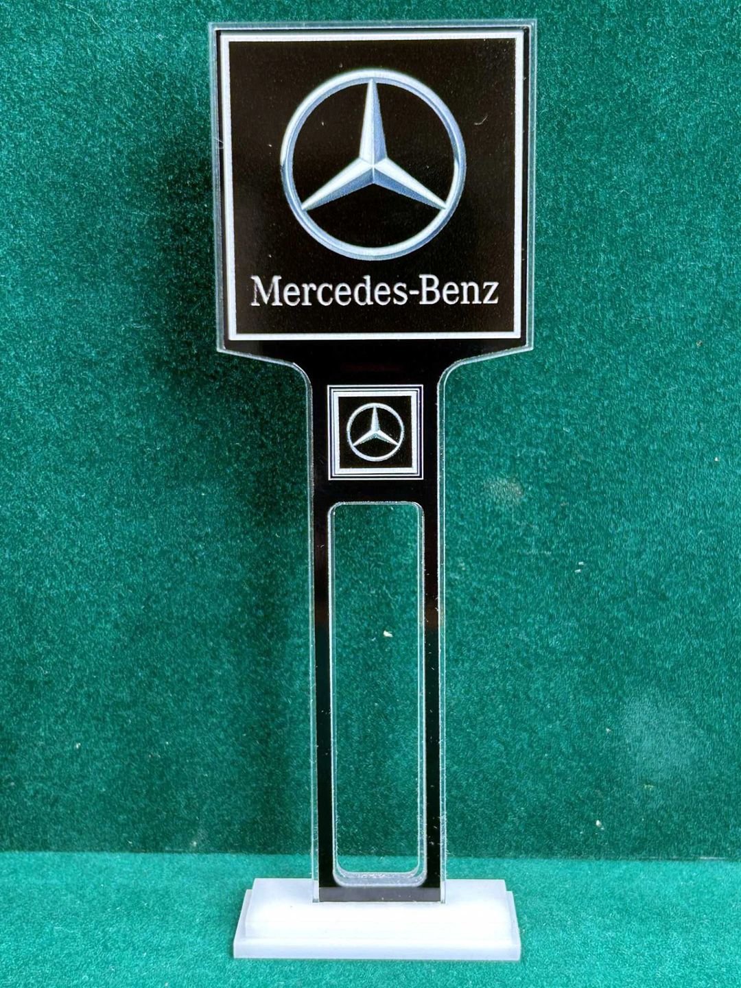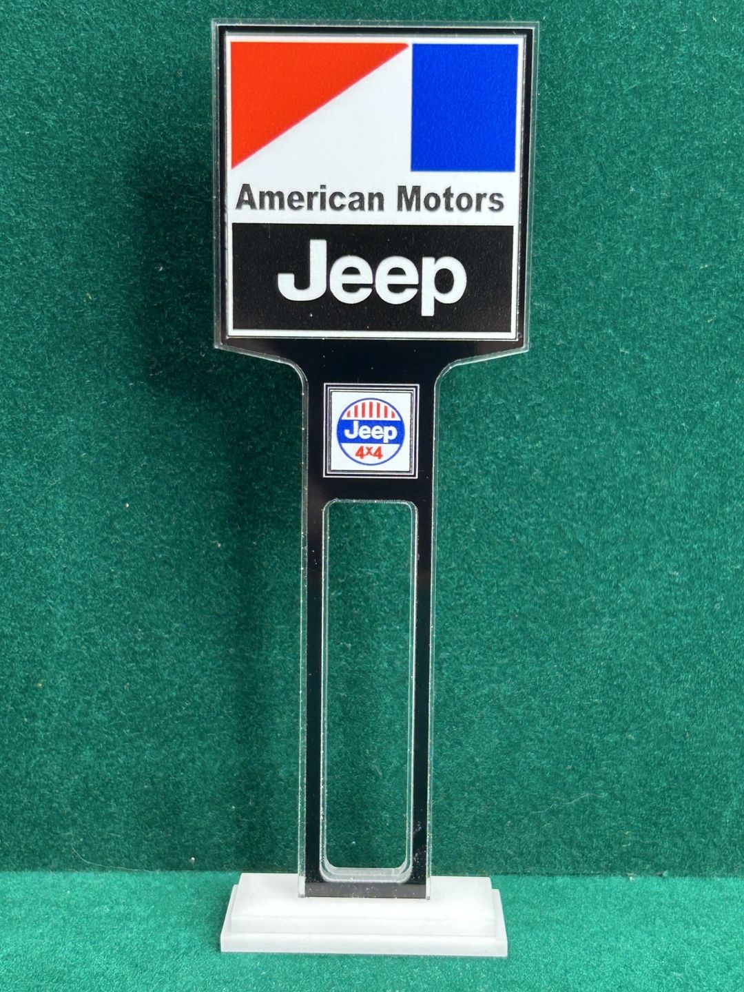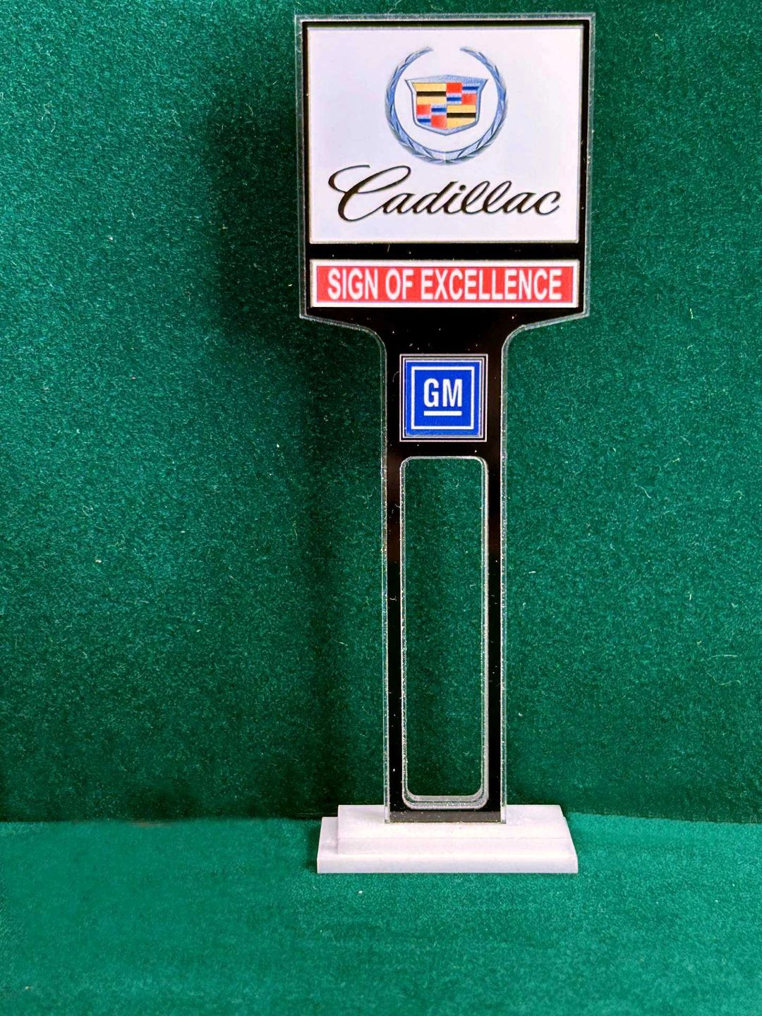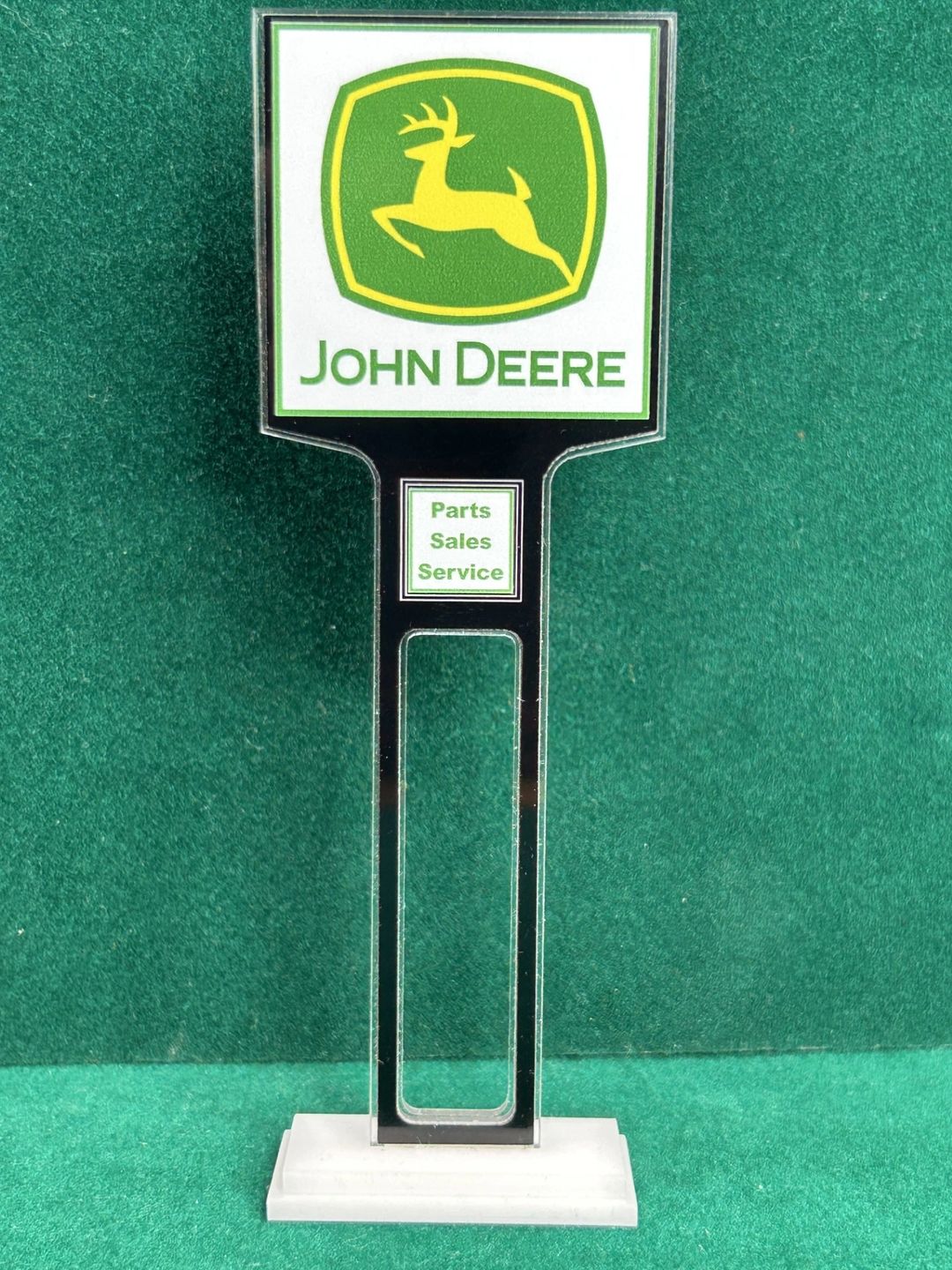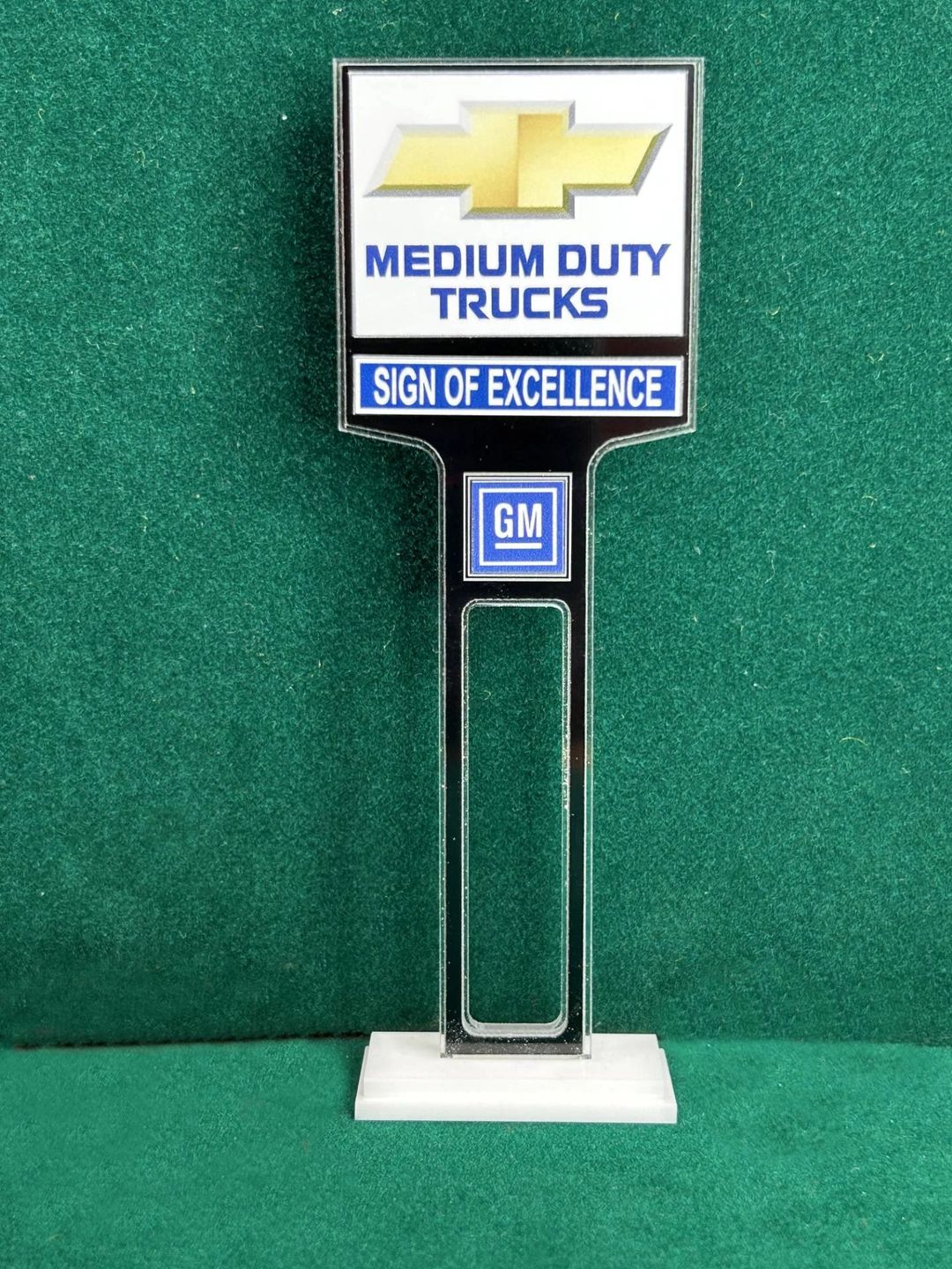 1/4” thick, white acrylic upright with a white acrylic overlay for the graphics. The base is 1/4” white acrylic. Approximate Size of the Dealership Lot Sign is 5.28” tall and 2.66” wide. Approximate Size of the Base is 2.66” x 1.00”