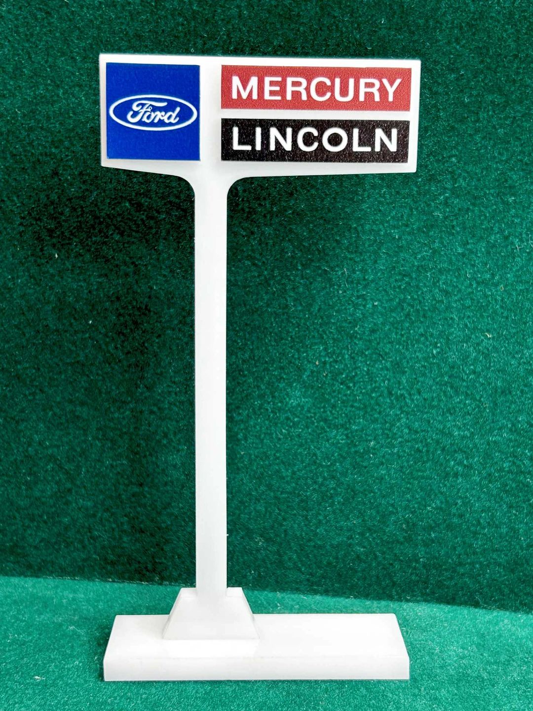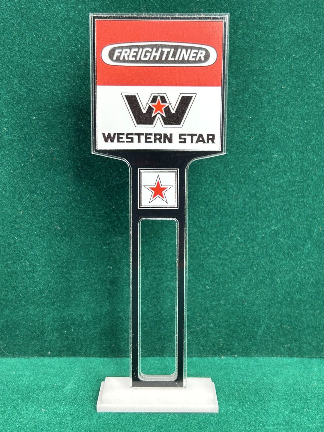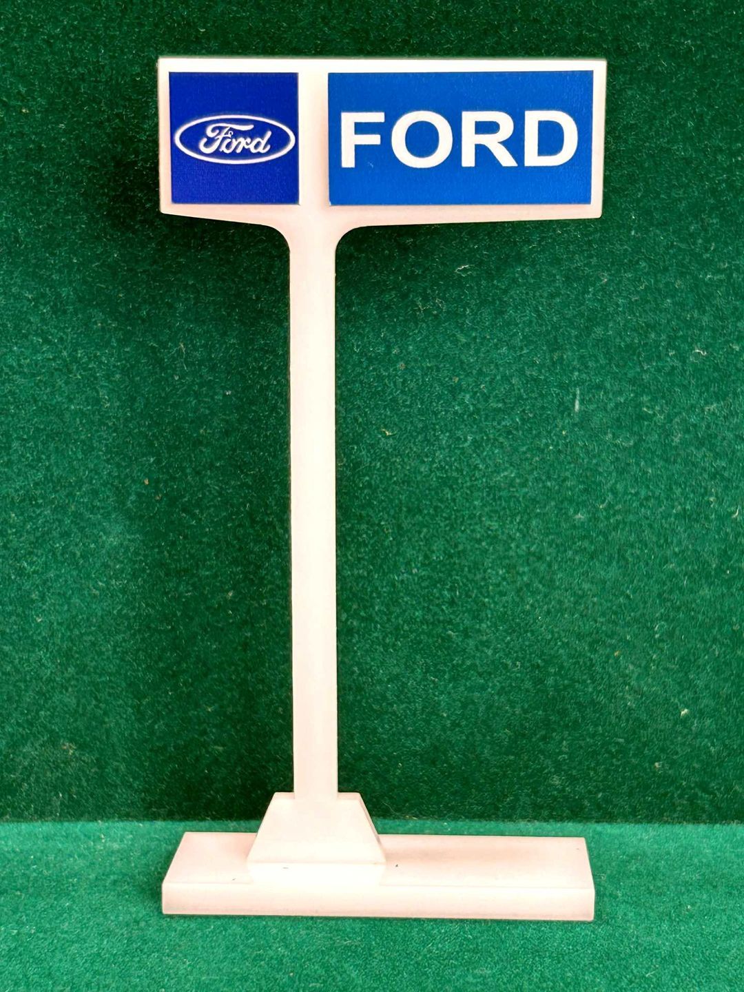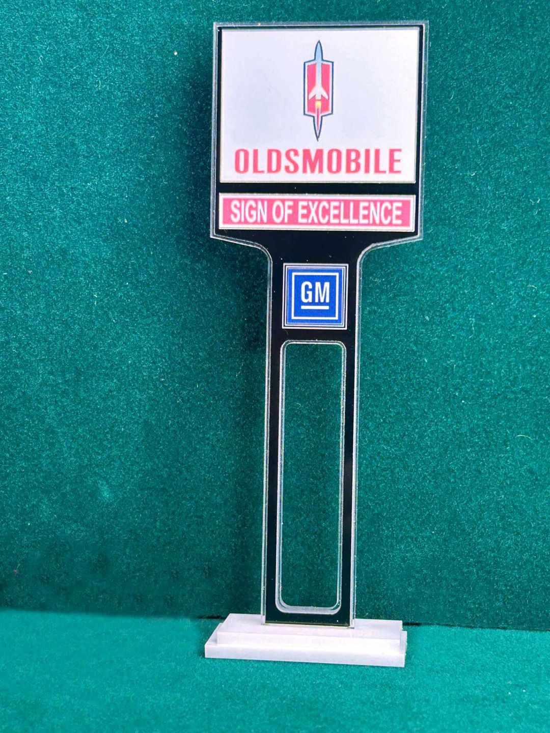 1/4” thick, white acrylic upright with a white acrylic overlay for the graphics. The base is 1/4” white acrylic. Approximate Size of the Dealership Lot Sign is 5.28” tall and 2.66” wide. Approximate Size of the Base is 2.66” x 1.00”