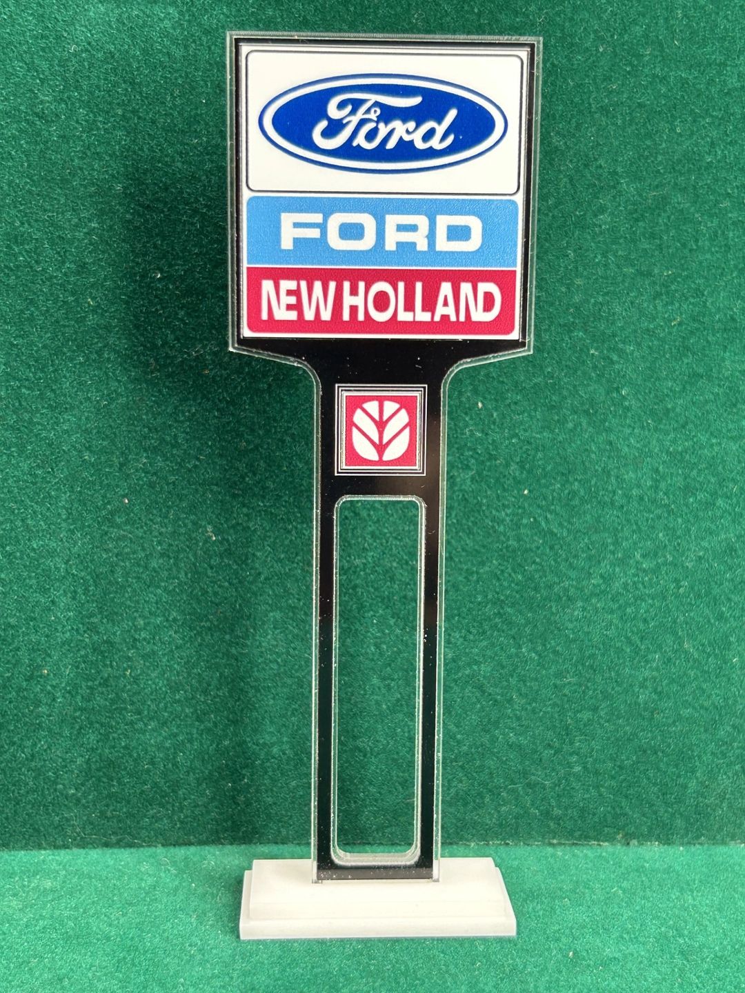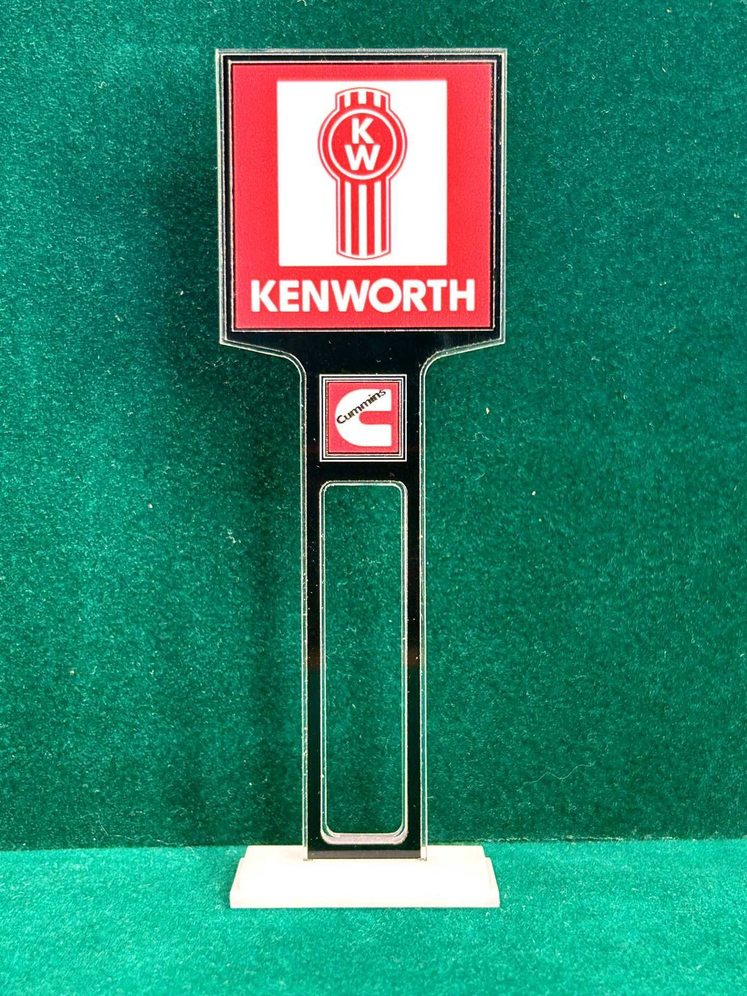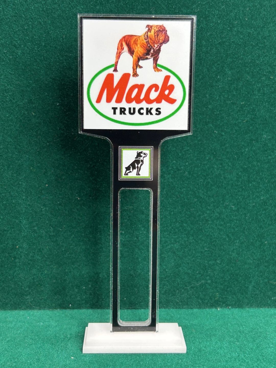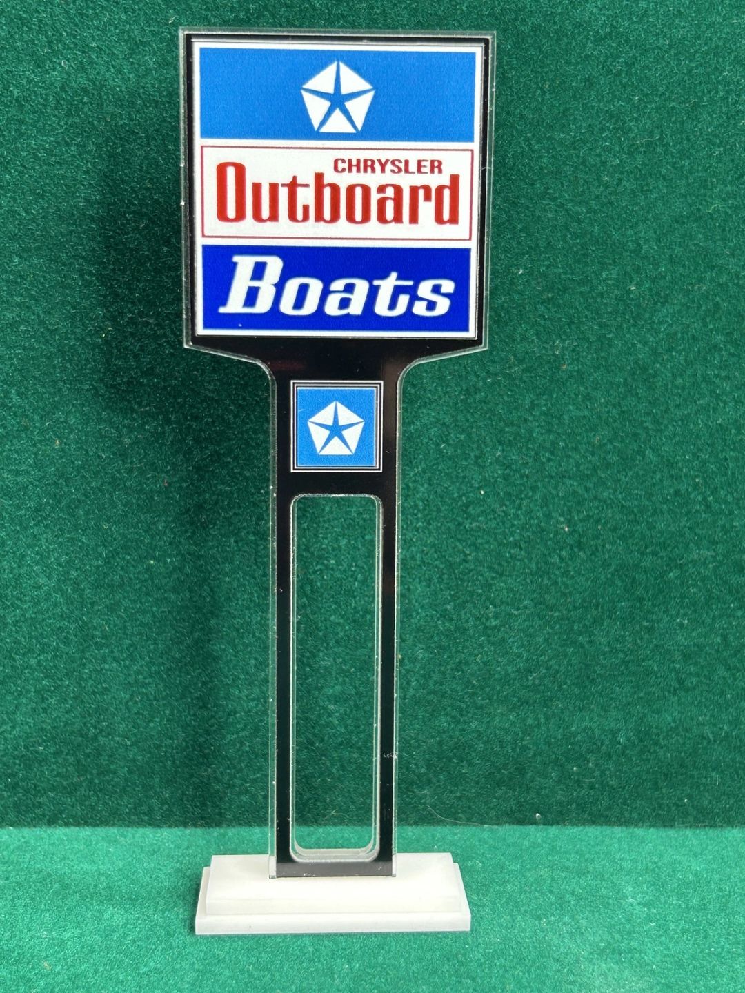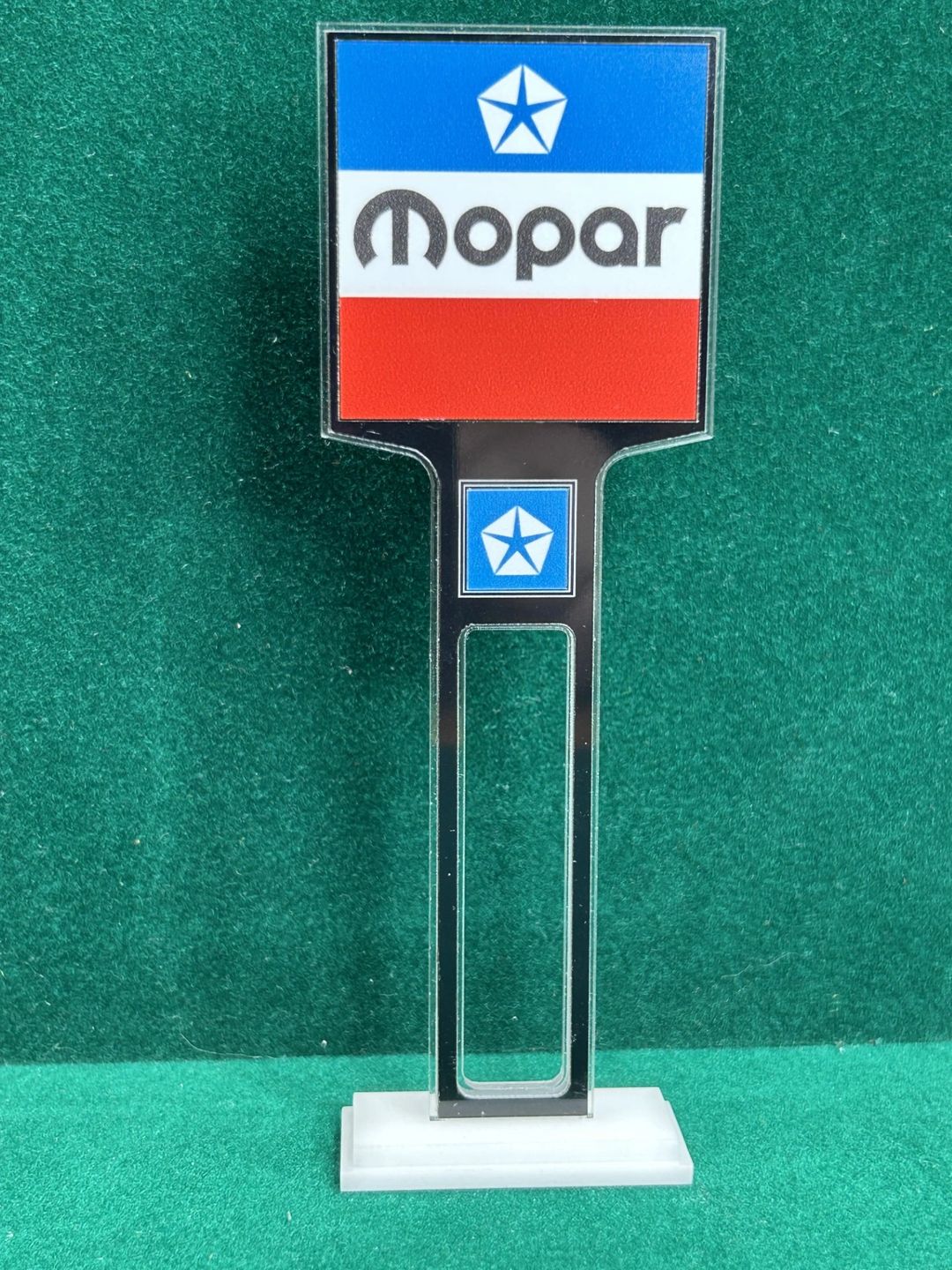 1/4” thick, white acrylic upright with a white acrylic overlay for the graphics. The base is 1/4” white acrylic. Approximate Size of the Dealership Lot Sign is 5.28” tall and 2.66” wide. Approximate Size of the Base is 2.66” x 1.00”