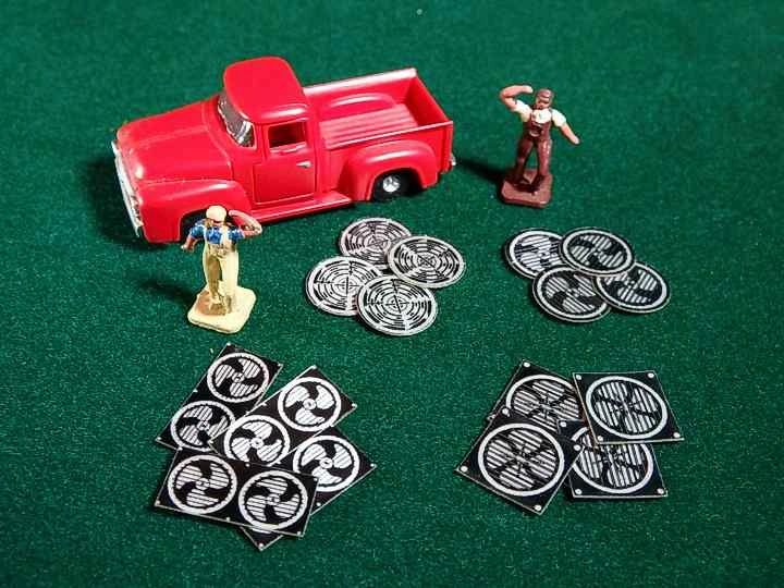 HO Scale. Peel-N-Stick 0.004" thick acrylic. 8 - 48" round fan designs. 4 - 48" square fan designs and 4 - 6' x 3' rectangle fan designs. 3 of each design. Truck and people not included.