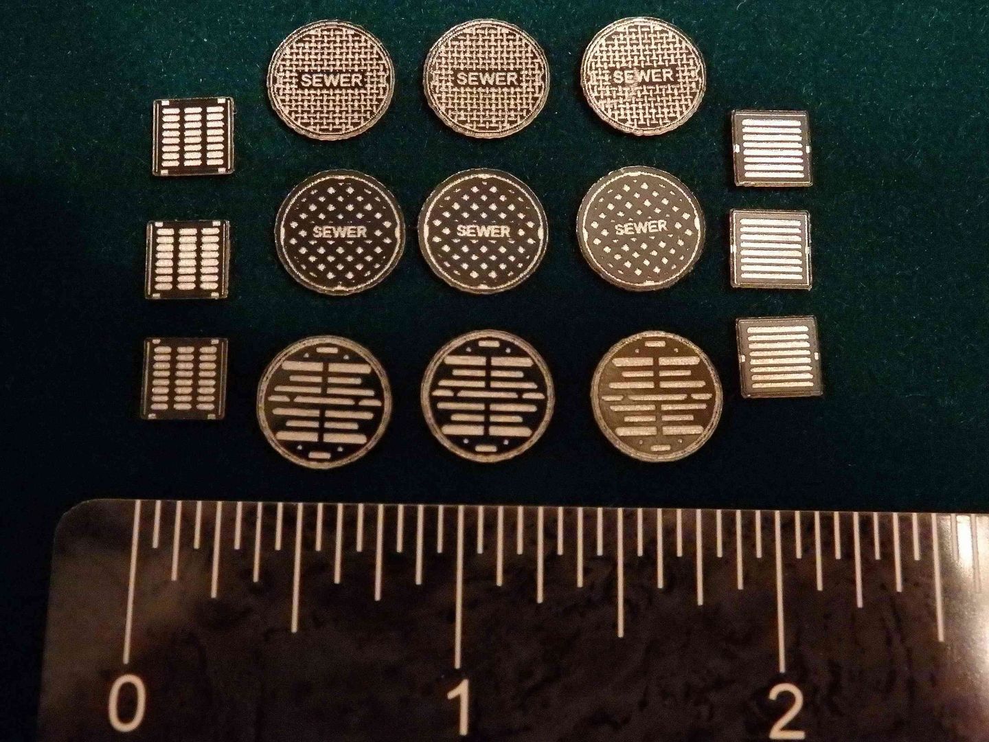 HO Scale. Peel-N-Stick 0.004" thick acrylic. 3 - 38" round manhole cover designs. 2 - 24" storm drains designs. 3 of each design. Ruler not included.
