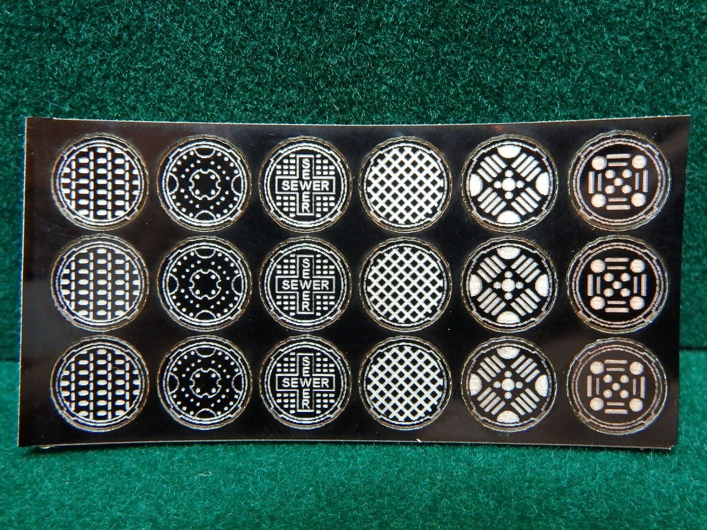 HO Scale. Peel-N-Stick 0.004" thick acrylic. 6 - 38" round manhole cover designs. 3 of each design.