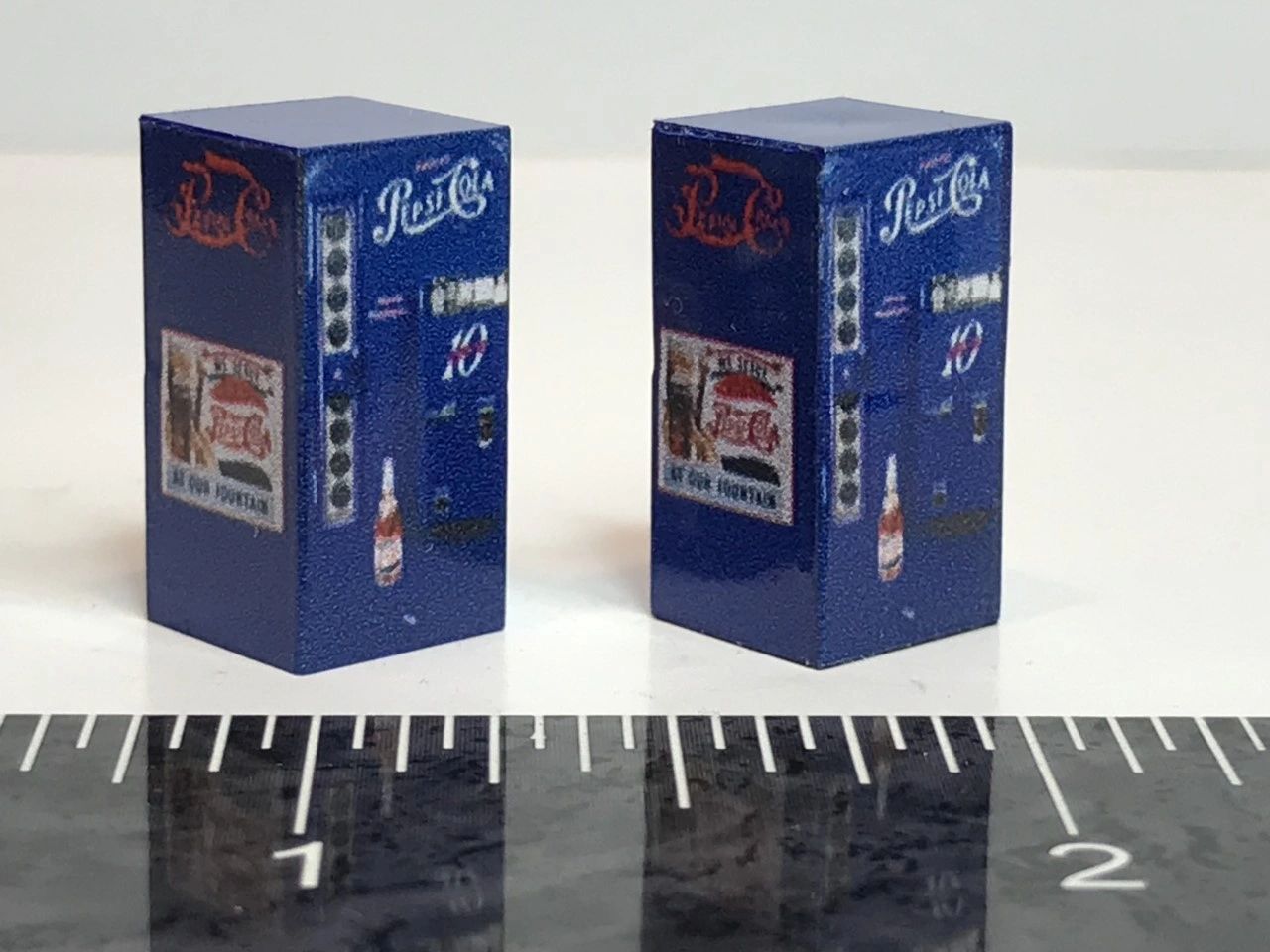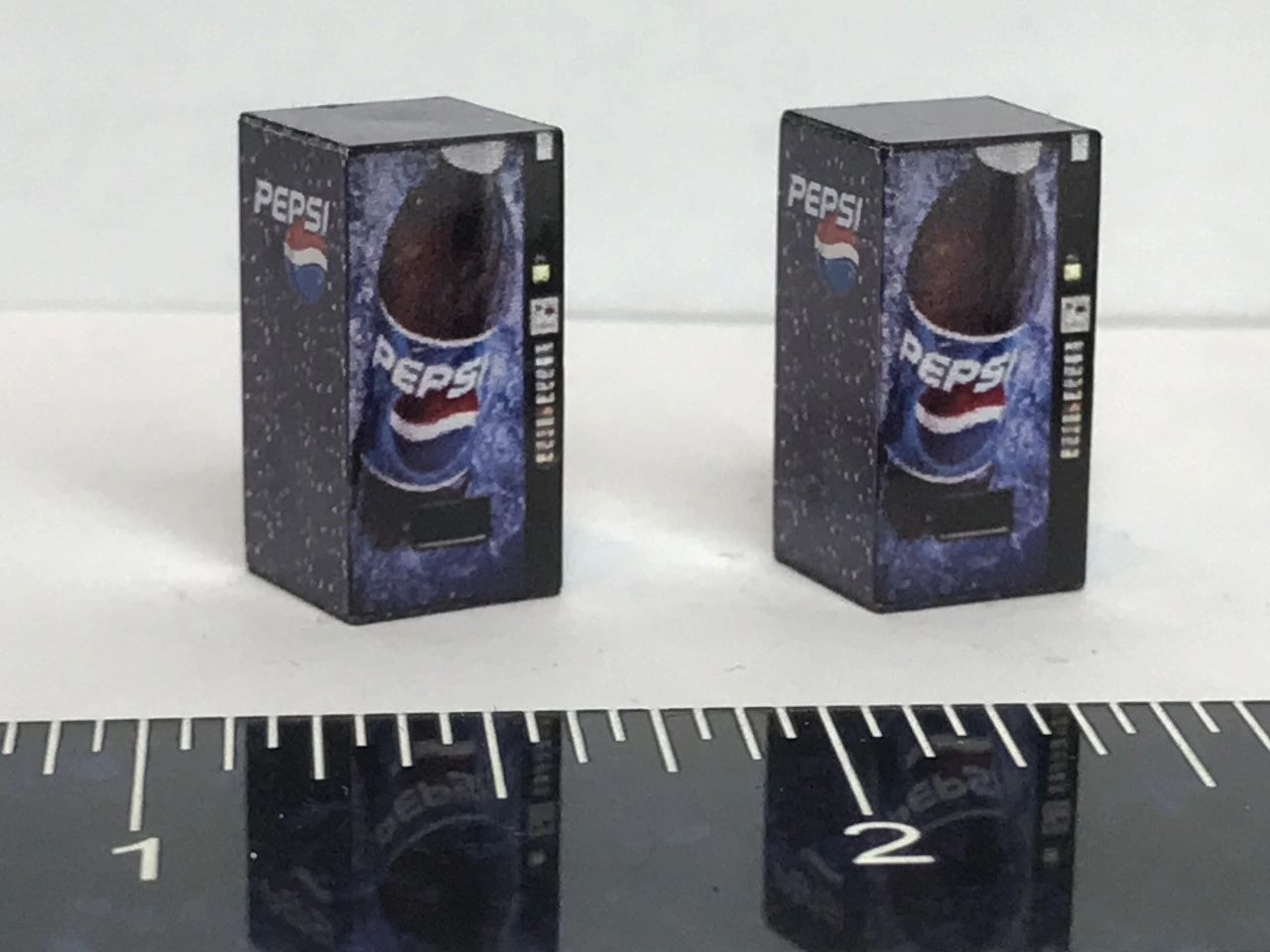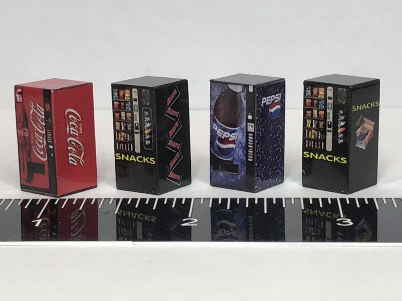 HO Scale. Coke Cola, Pepsi Cola, Snack #1 and Snack #2. Solid plastic core with printed vinyl wrapper. Ruler not included.