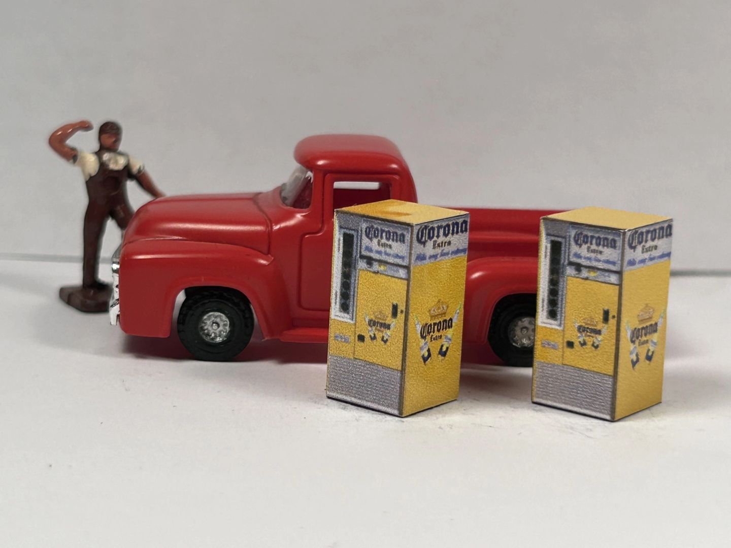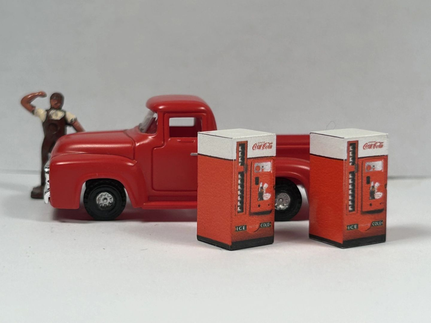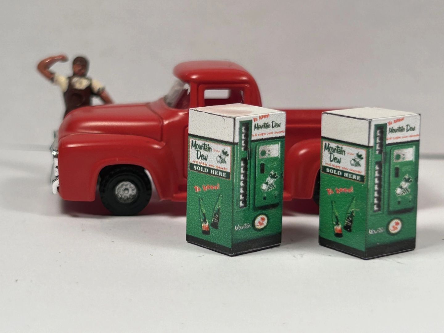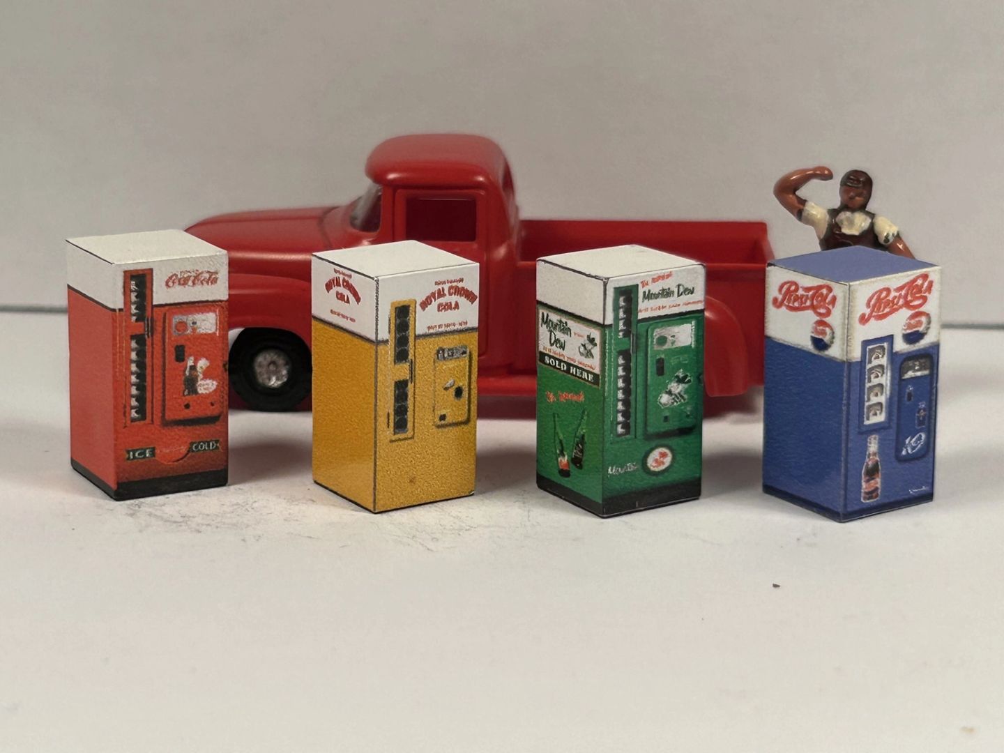 HO Scale. Coke Cola, Royal Crown Cola, Mountain Dew and Pepsi Cola. Solid plastic core with printed vinyl wrapper. Truck and people not included.