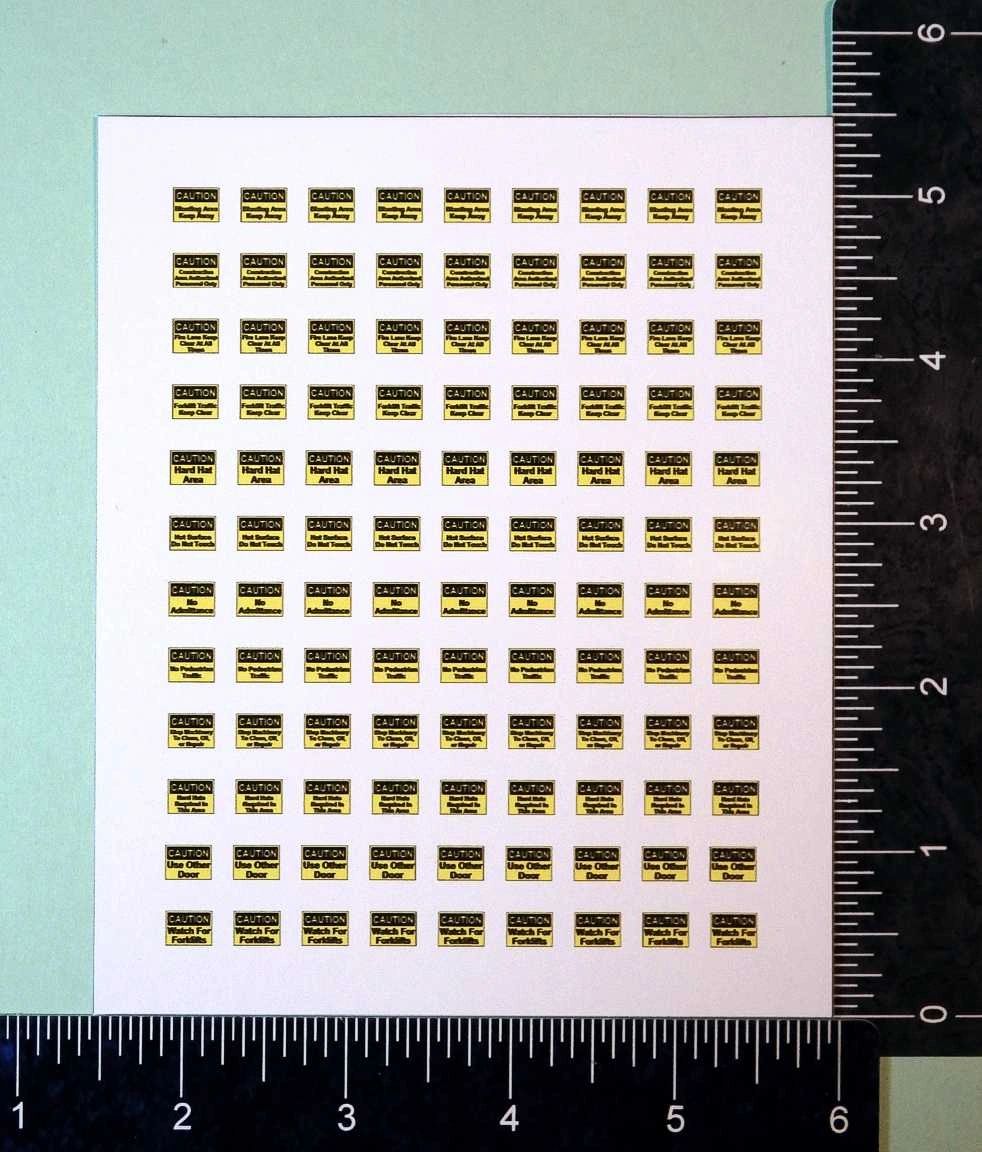 HO Scale. 108 Caution signs - 12 designs with 9 of each design. Printed vinyl.