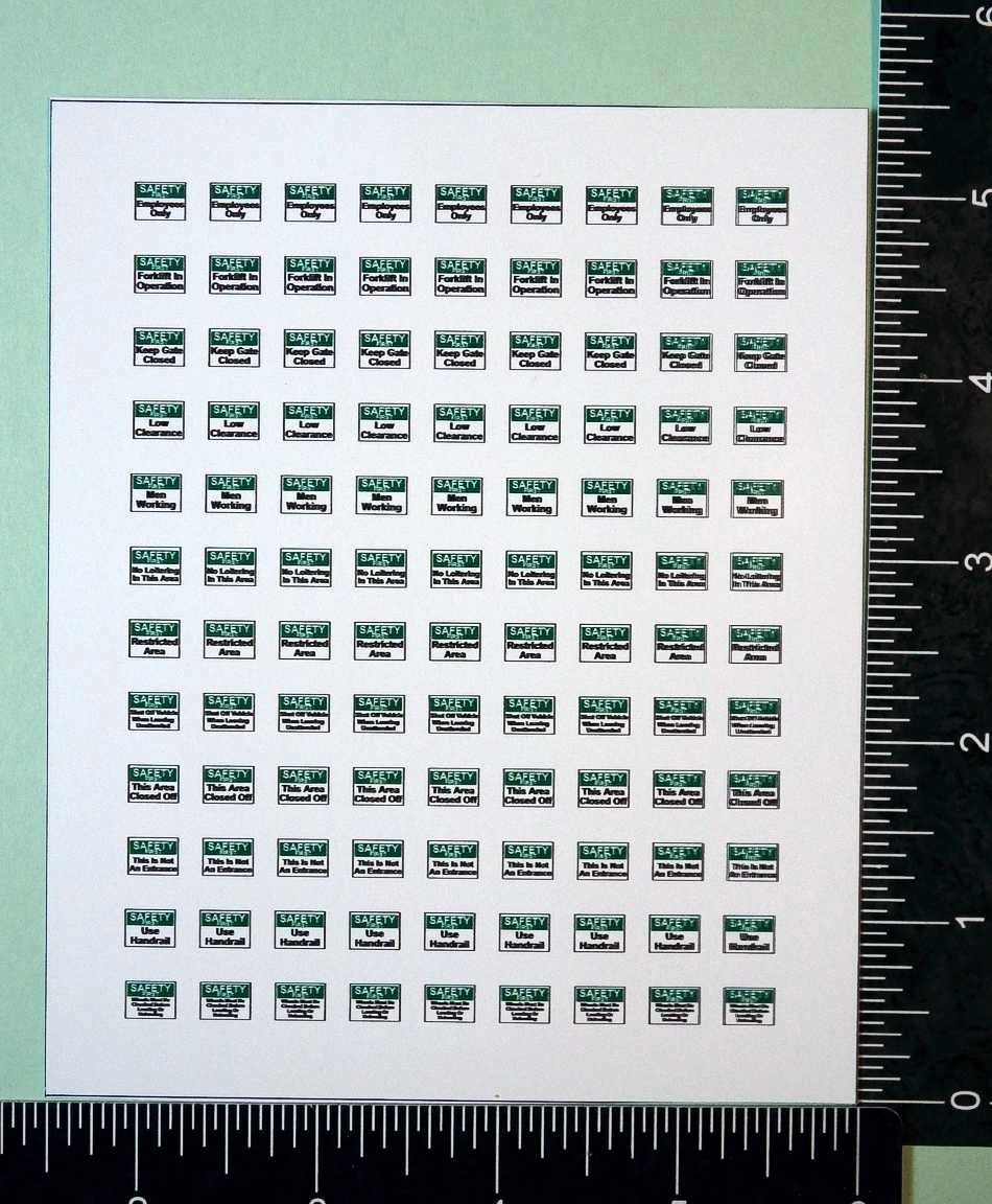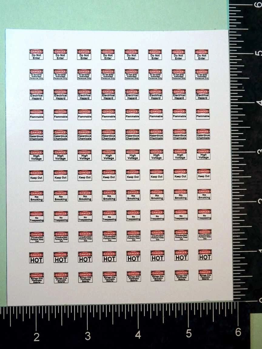 HO Scale. 96 Danger signs - 12 designs with 8 of each design. Printed vinyl.