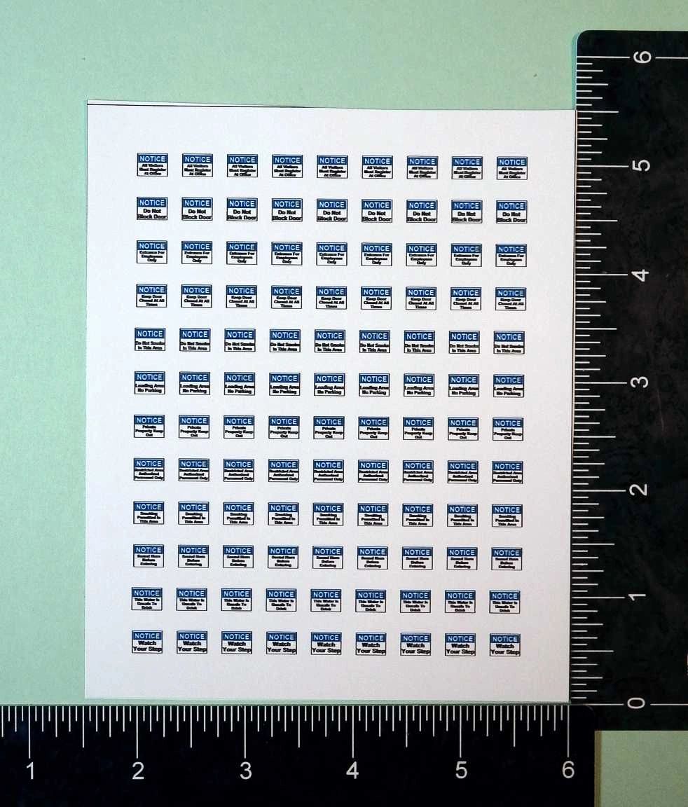 HO Scale. 108 Notice signs - 12 designs with 9 of each design. Printed vinyl.